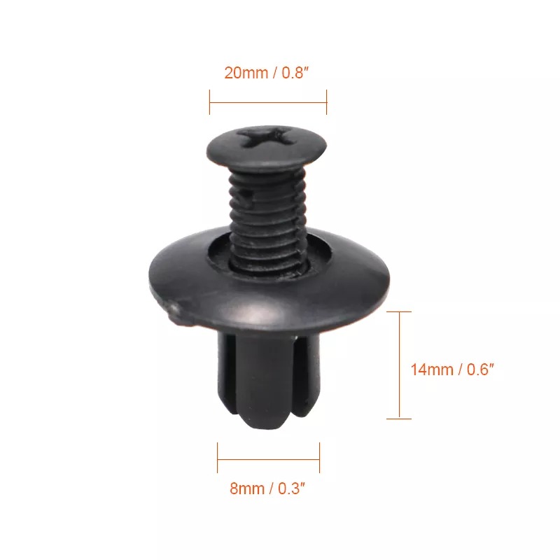 One Size Fits Most – Head Diameter: 20mm/ 0.8 inches; Stem Length: 22.8mm/0.9 inches; Fits Into: 8mm /0.3 inches hole. These universal push-type fastener clips will fit on most of auto parts with 8mm hole, hold your parts very tightly.