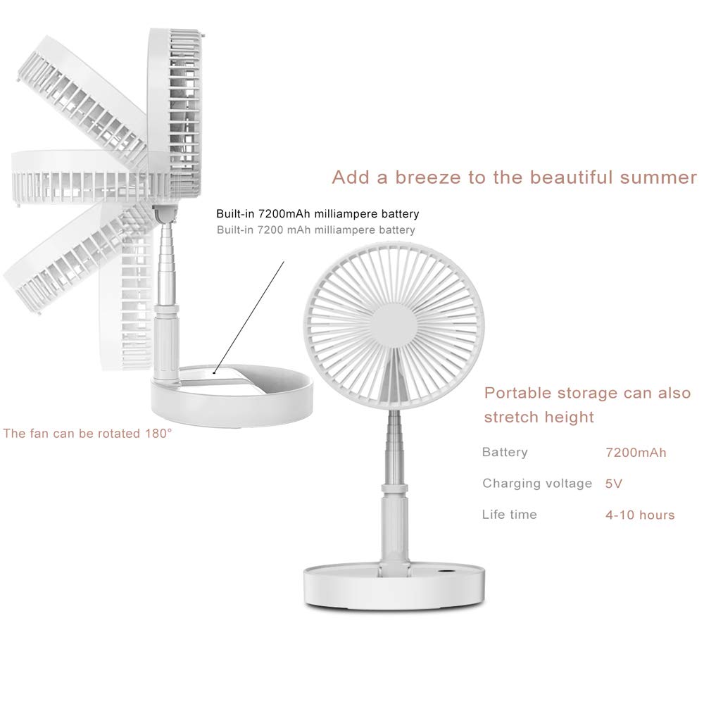 7200 mAH built-in battery, lightweight, easy to carry, multi-function application, stretchable height, multiple ways of use as one: countertop + floor + storage integrated fan.