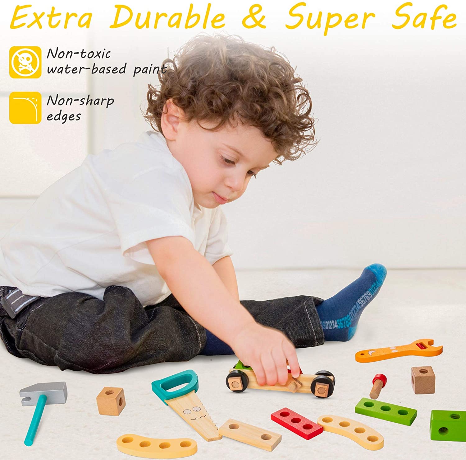 【Best Gift for Kids】The wooden toolbox kit playset makes a great gift for kids ages 3 and up. Colorful and durable, it is the perfect gift for boys and girls. They are non-sharp compared with real tools, keep your children away from hurt.