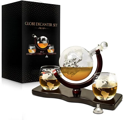 WOODEN BASE STAND: These decanters for alcohol include a decanter stopper and two (2) clear whiskey glasses with 300ml (10 oz) capacity each. The glass globe decanter conveniently detaches from its mahogany-stained wooden base stand