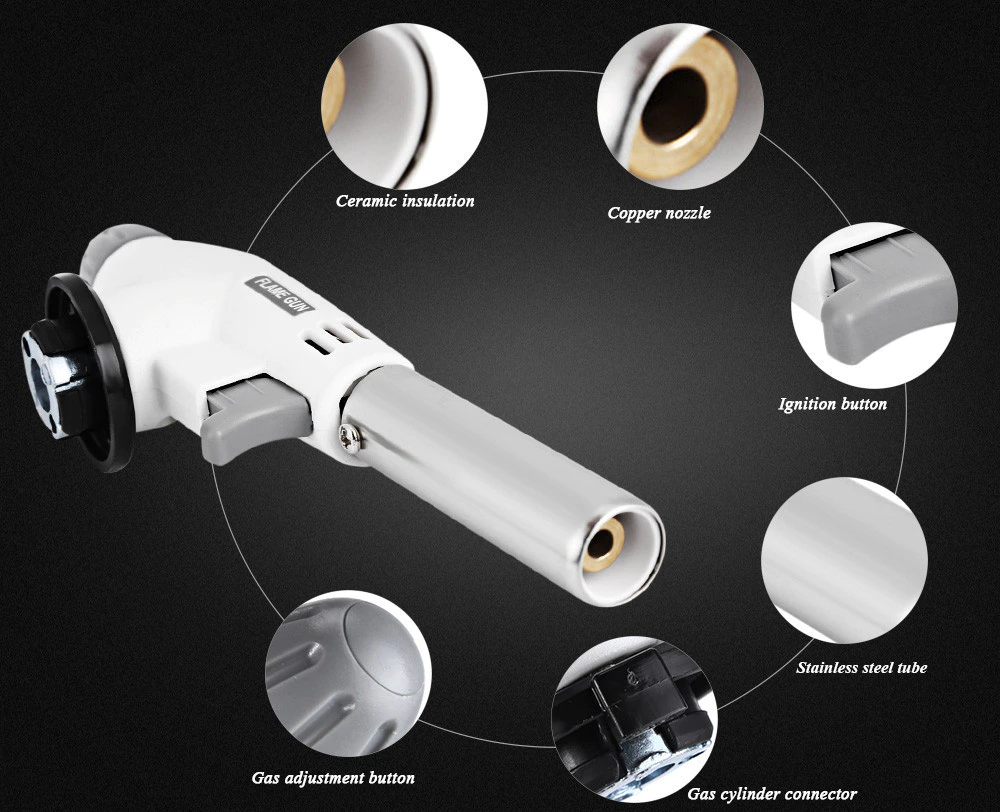 Adjustable flame intensity temperature can reach up to 1300 c/2500 F to meet various needs, you can choose the different flame according to your requirement (Soft fire or Spitfire). Just press to light fire, easy to operate with the gas flow regulator and air flow control valve cooking torch, can be flame intensity controlled, close the valve switch, the flame goes off!